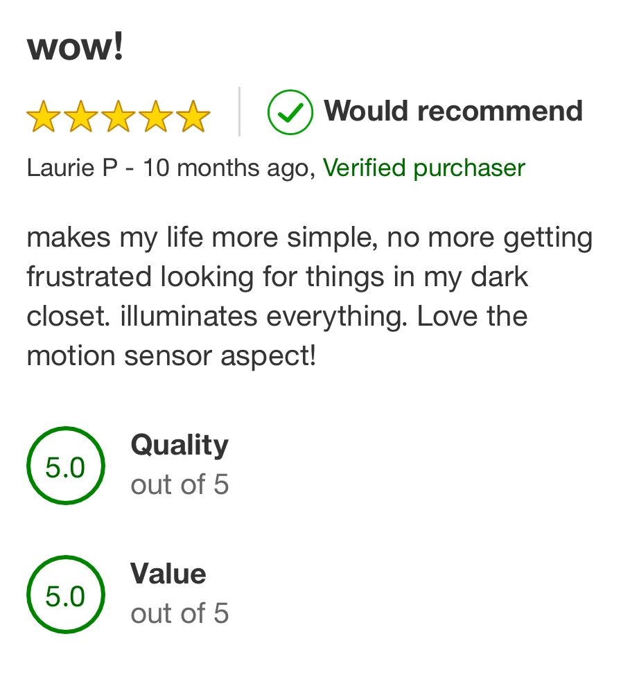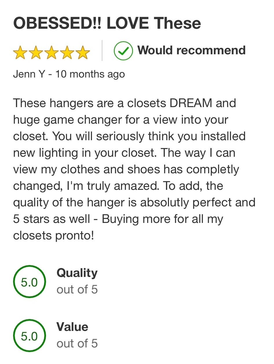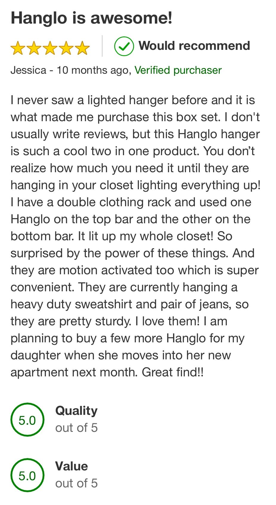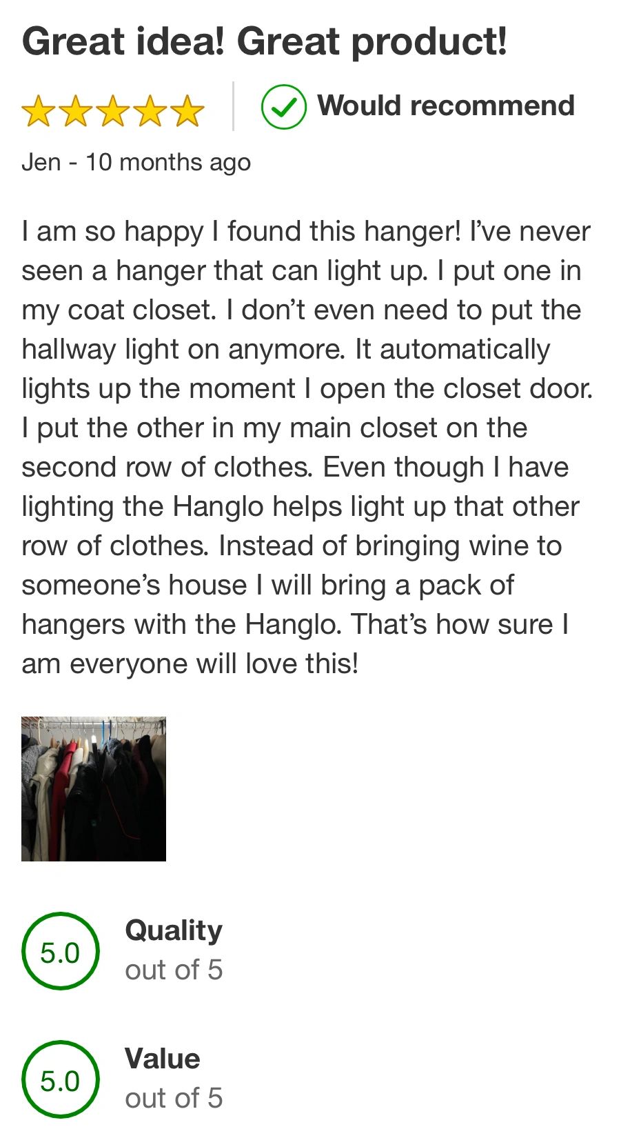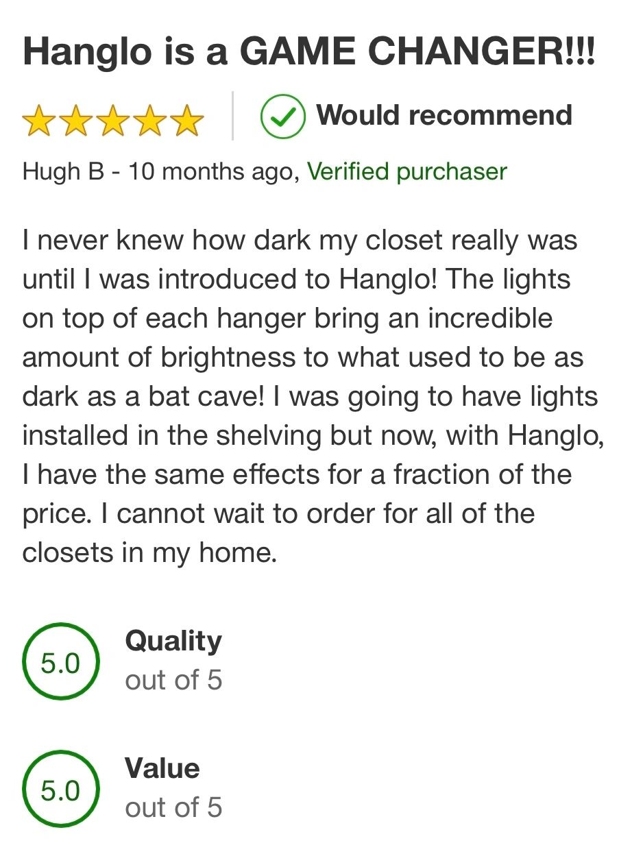 Gail recommends Hanglo not only because they light her closet so well, but because of the high quality hanger itself.